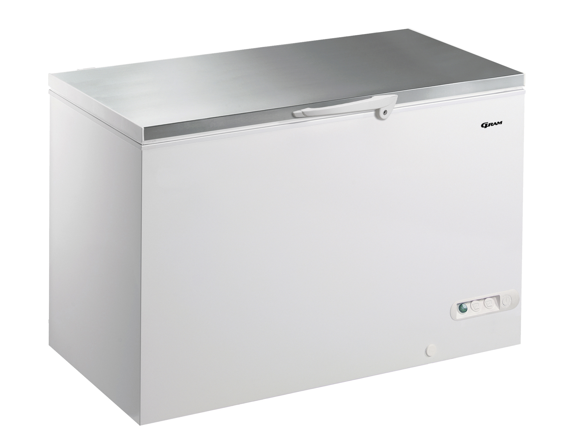 Low Energy Chest Freezer Equipped with lift up stainless led, handle and lock, defrost water drain complete with 3 wire baskets. Temperature range -22 / -14°c Volume Gross:300 Ltr Dimensions including handle & hinges:1300 x 730 x 865 mm Exterior / Interior: White hammered alu Castors