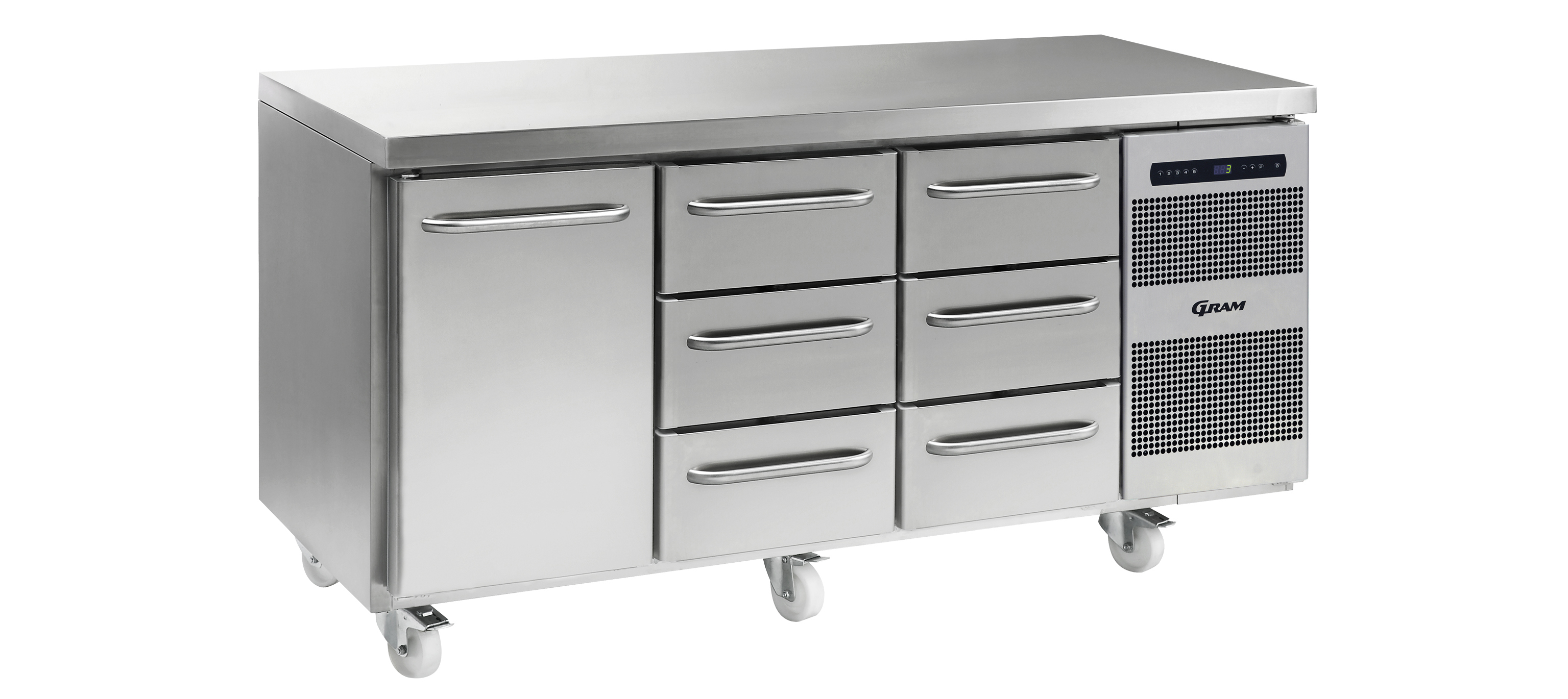 Con GRAM GASTRO 07, podrá construir su propio lugar de trabajo. Seleccione una combinación de superficie de trabajo, puertas y cajones, patas, ruedas o elevación eléctrica, rangos de temperatura y accesorios.