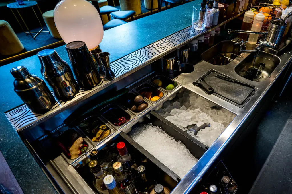 Effectively managing the floor space is critical for the flow of your bar. Timo continues describing The Flying Dutchman Cocktails saying “the entire bar is on a stage to give bartenders an elevated view of guests and everything is at an optimal height (86cm) and distance (50cm). The bar is a stage for entertaining and engaging with guests. Everything off-stage needs to be efficient and readily available. To maximise efficiency, bar owners need to define what is on stage and what is off stage and use those defined boundaries to shape the layout of their bar.”