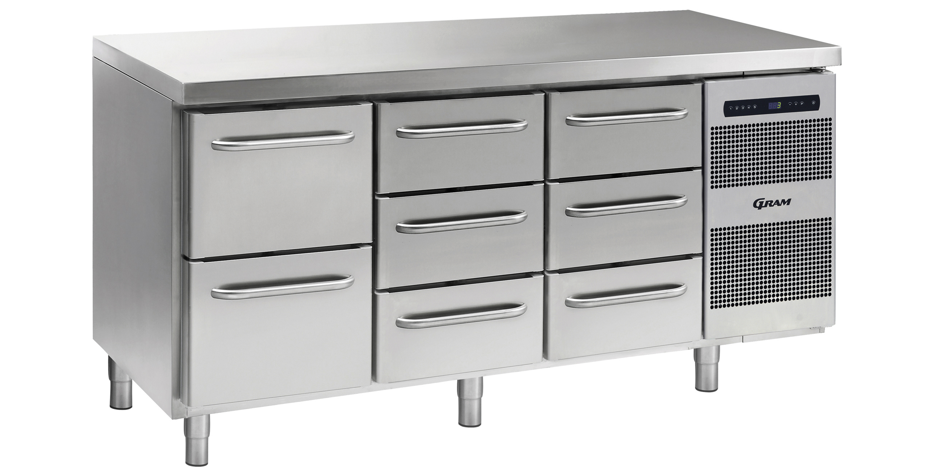 Equipped with stainless steel solid top, 1 drawer section with 2 x 1/2 drawers and 2 drawer sections each with 3 x 1/3 drawers. Height: 885/950 mm Worktop depth: 700 mm Volume, gross: 506 ltr. Exterior/Interior: Stainless/Stainless GASTRO 07 comprises of 1/1 GN counters, available with 2, 3 or 4 sections. Flat worktop or saladette worktop. Doors or drawers, with or without lock. Standard refrigeration (+2/+12°C), extended refrigeration (-5/+12°C) or freezing (-25/-5°C). Available with electronic elevation and prepared for remote compressor.