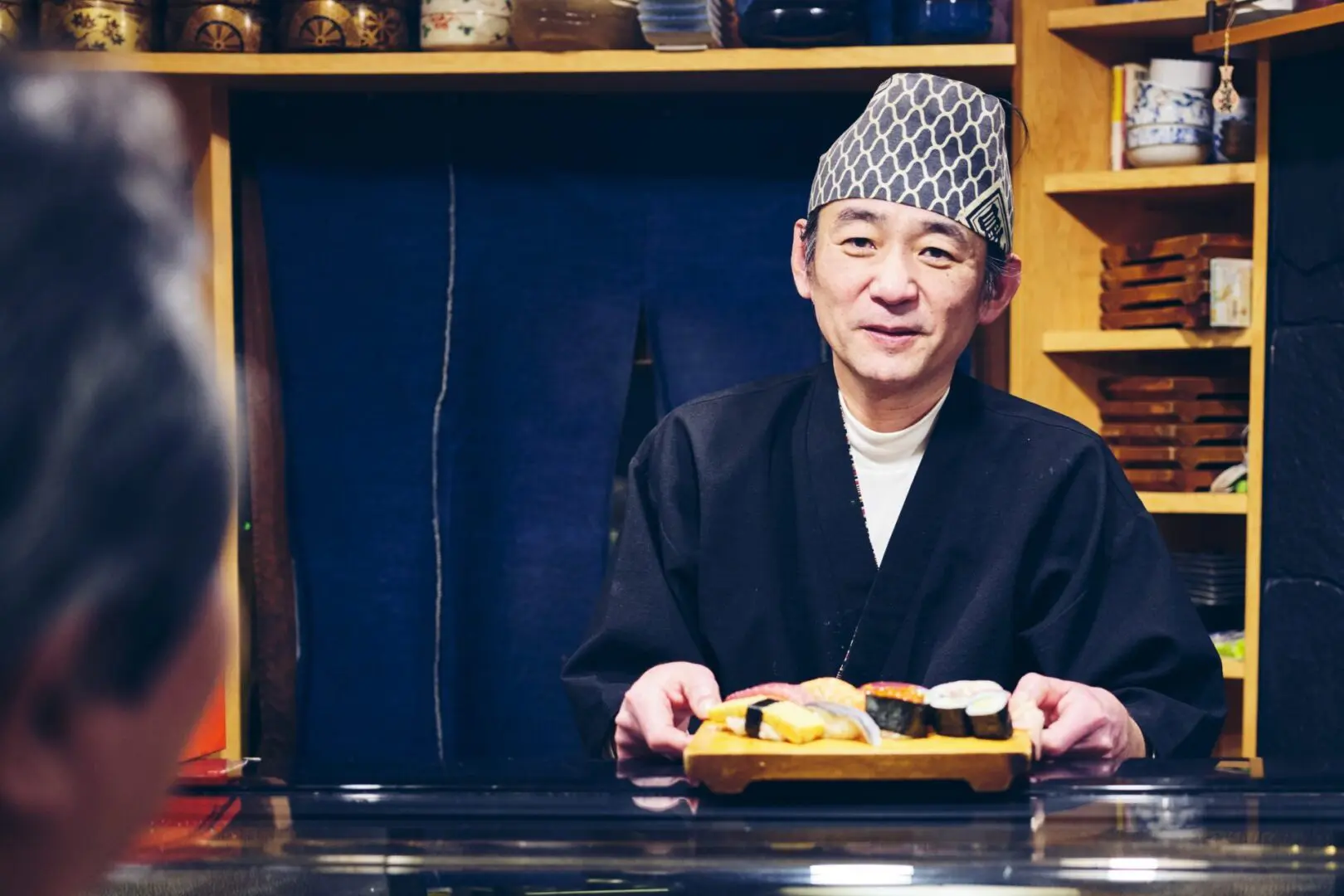 A Japanese sushi chef serving customers in a small sushi shop in Tokyo, Japan.