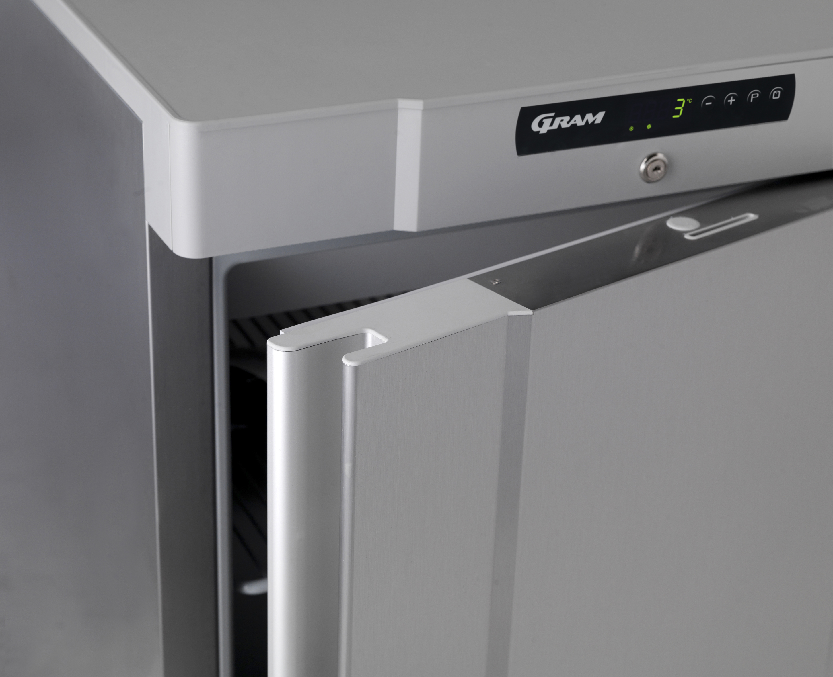 Undercounter Refrigerator for Marine use Equipped with right hand hinged reversible door with lock, 2 stainless marine shelves, 1 stainless bottom shelf. Height: 830mm